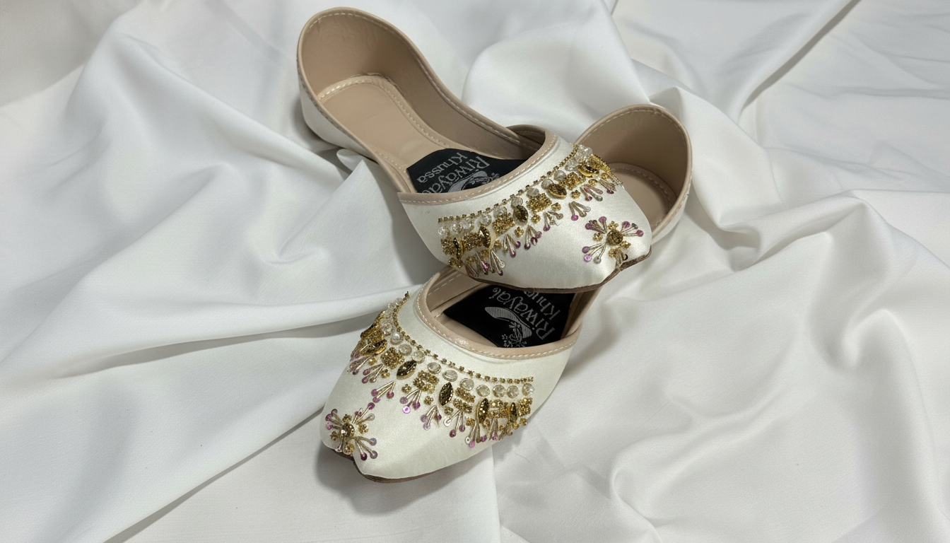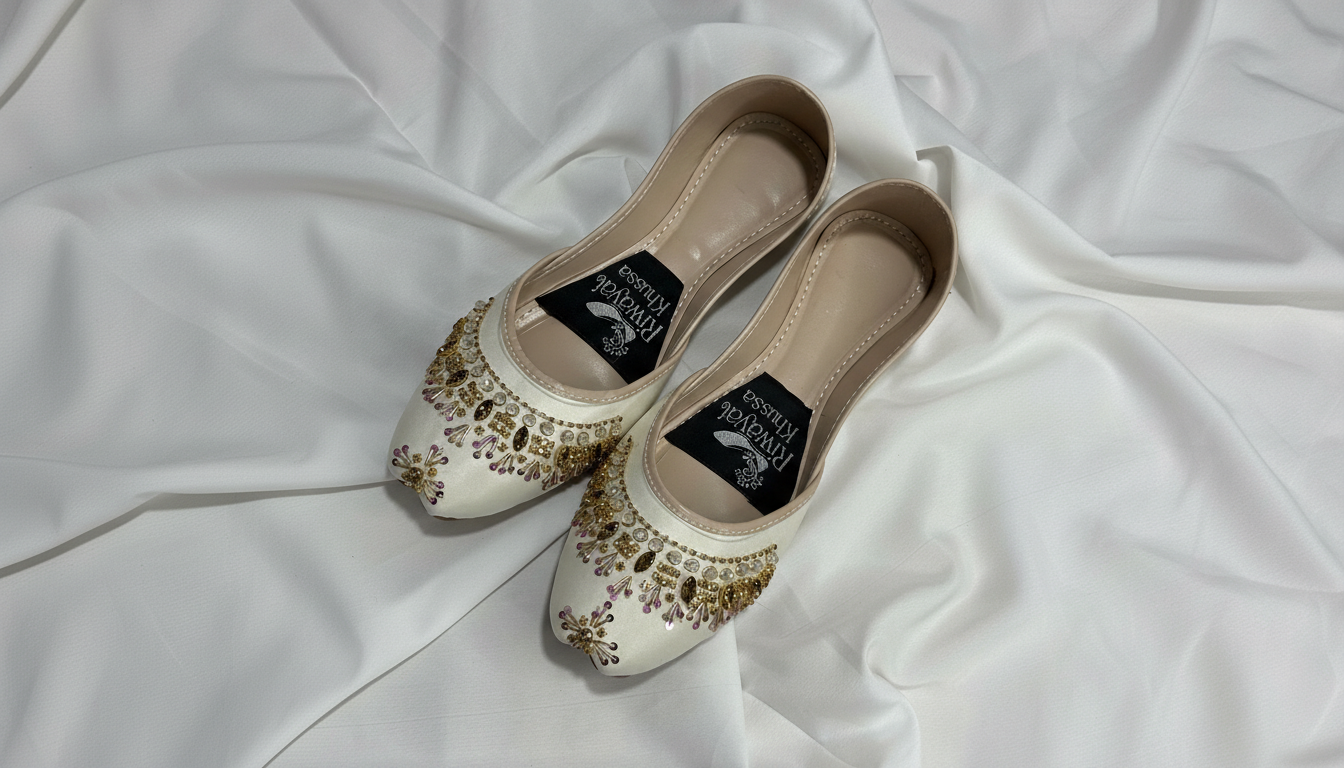 Featuring delicate hand embroidery on a classic white base, this khussa offers a graceful and sophisticated look. Each pair is carefully handcrafted by skilled artisans using premium materials to ensure durability, quality, and comfort.