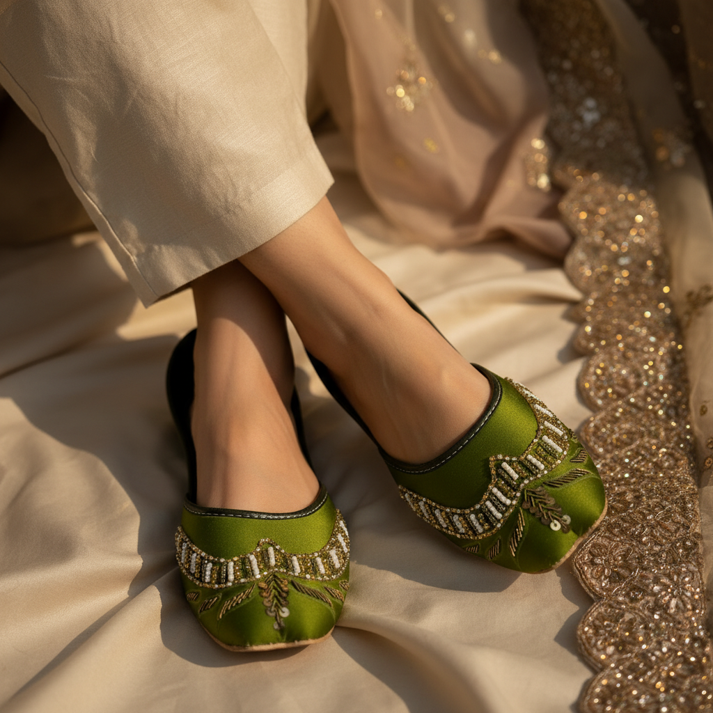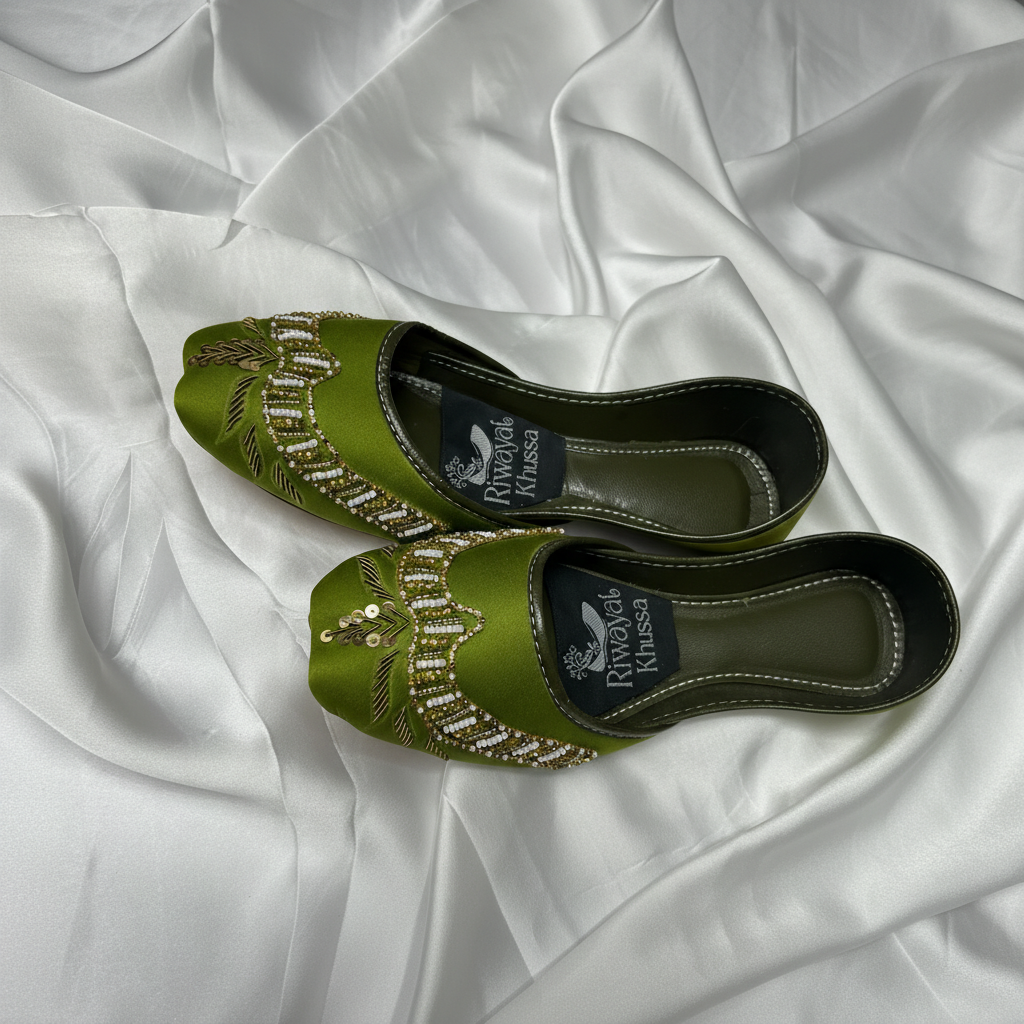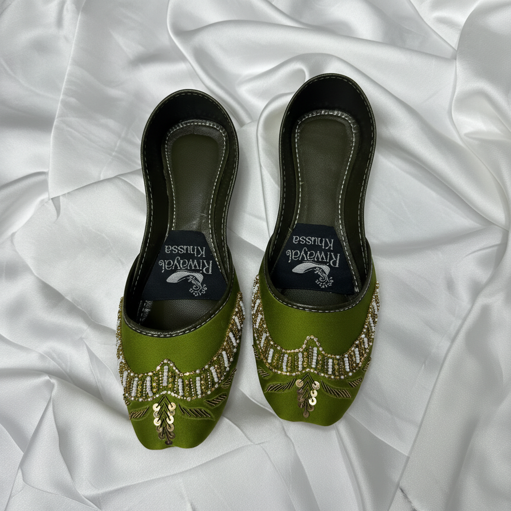 Add a touch of elegance to your traditional wardrobe with our M1 Mehendi Handmade Khussa from the Rajasthani Riwayat Collection. Inspired by the rich heritage of Rajasthani craftsmanship, this beautifully handcrafted khussa represents a perfect blend of tradition and modern style. Designed with intricate hand embroidery on a rich mehendi-green base, this khussa creates a graceful and traditional look that complements festive and cultural outfits. Each pair is carefully handmade by skilled artisans using premium quality materials to ensure durability, comfort, and a refined finish. The soft cushioned inner sole provides exceptional comfort, making it ideal for weddings, Eid celebrations, festive events, and traditional gatherings. The Rajasthani Riwayat Collection celebrates authentic craftsmanship and timeless elegance.